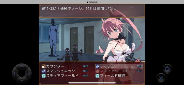 ボス戦・・・相手からの拘束攻撃で3択を迫られます。「掴みかかり」は押し返し、「体当たり」は回避で対処することが出来ます。拘束攻撃の対処さえ出来れば普通に攻撃しているだけでMPが貯まるので後は必殺「リールトルネード」で倒しましょう。(負けるとHイベント後ゲームオーバー)